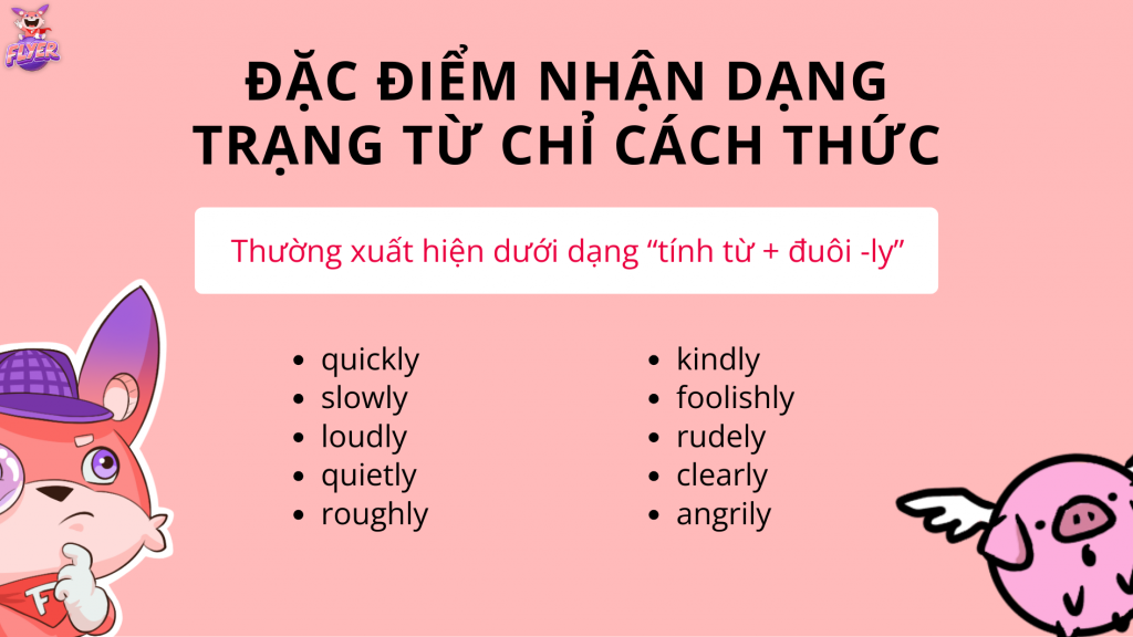 Thông thường, trạng từ chỉ cách thức sẽ xuất hiện dưới dạng “tính từ + đuôi -ly”.