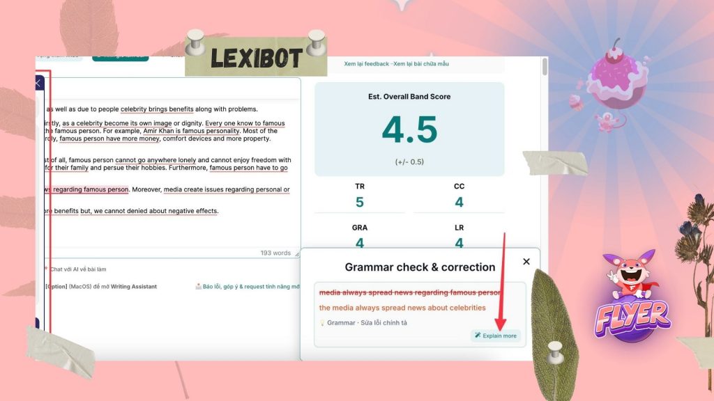 LexiBot là một công cụ khá hay dành cho những bạn đang ôn luyện IELTS Writing, đặc biệt là Writing Task 2. Công cụ này sử dụng trí tuệ nhân tạo (AI) để chấm và chữa bài miễn phí dựa trên bốn tiêu chí chính thức, đồng thời đưa ra nhận xét chi tiết cho từng tiêu chí.