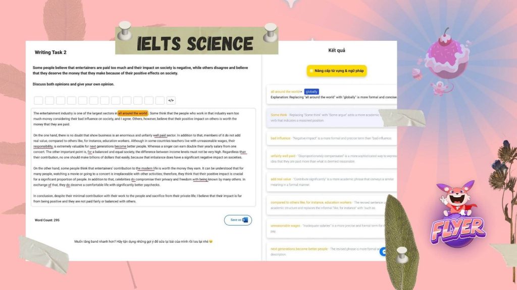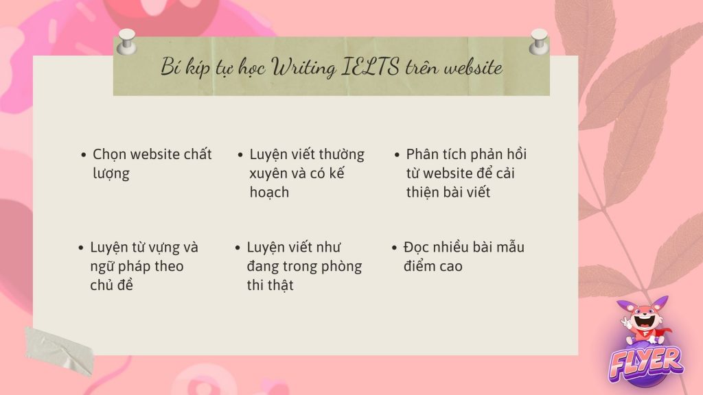 Luyện viết mãi nhưng điểm số vẫn giậm chân tại chỗ là nỗi trăn trở của không ít “sĩ tử” khi luyện Writing IELTS. Để nâng trình kỹ năng Writing một cách nhanh chóng, ngoài viết thường xuyên, bạn còn cần một công cụ giúp phản hồi chi tiết về các lỗi sai, gợi ý cách lập luận và triển khai ý tưởng sao cho hấp dẫn. Trong bài viết này, FLYER sẽ gợi ý top 13 trang web luyện Writing IELTS đáng tin cậy. Đây sẽ là những trợ thủ đắc lực giúp bạn viết tốt hơn và tiến bộ rõ rệt chỉ trong thời gian ngắn.