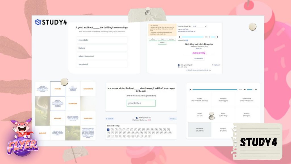 Trang này cung cấp kho từ vựng khá phong phú, được phân chia cụ thể theo từng chủ đề quen thuộc trong cuộc sống, học tập và thi cử. Mỗi từ đều có hình ảnh minh họa, ví dụ cụ thể và bài tập tương tác đi kèm giúp bạn nhớ lâu hơn và học từ một cách dễ hiểu, không bị nhàm chán.