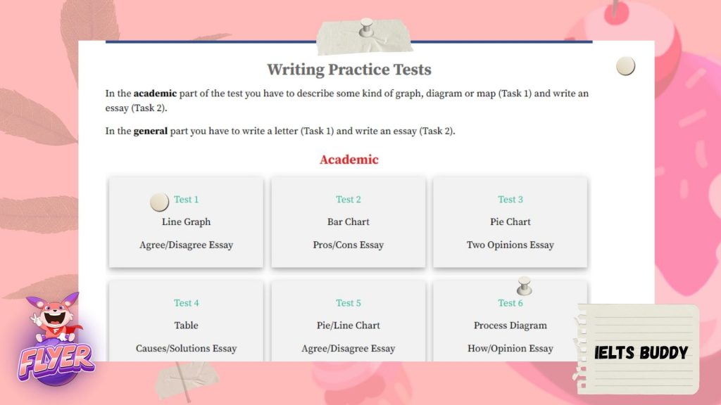 IELTS Buddy cũng là một trang web luyện thi IELTS miễn phí quen thuộc, giúp bạn ôn tập miễn phí cho cả hai hình thức thi IELTS Academic và IELTS General Training. Đặc biệt, nếu bạn muốn luyện Writing với từng dạng đề riêng lẻ hoặc tìm tài liệu học hữu ích, trang web này sẽ là một lựa chọn mà bạn nhất định không được bỏ qua!