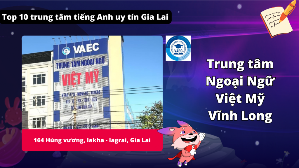 | Trung tâm Ngoại Ngữ Việt Mỹ Vĩnh Long (VAEC) | 164 Hùng vương, lakha – lagrai, Gia Lai | Từ 800.000 VNĐ/ tháng |