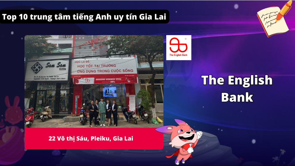 “Ngân hàng tiếng Anh thực dụng” – The English Bank sử dụng phương pháp ứng dụng tiếng Anh trong thực tế nhằm hỗ trợ học viên thực sự hiểu và sử dụng Anh ngữ bên cạnh luyện thi các chứng chỉ quốc tế. The English Bank thuộc top những trung tâm tiếng Anh uy tín tại Gia Lai.