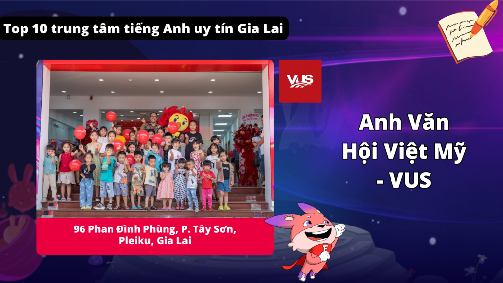 | Anh văn Hội Việt Mỹ – VUS | 96 Phan Đình Phùng, P. Tây Sơn, Pleiku, Gia Lai | Từ 5.000.000 VNĐ/ khóa |