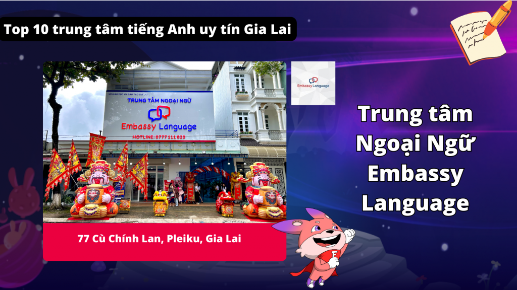 Embassy Language là trung tâm tiếng Anh uy tín Gia Lai để cải thiện giao tiếp. Với phương châm “Unlock your language potential” (Khai phá tiềm năng ngôn ngữ của bạn), Embassy Language hướng đến phát triển toàn diện tiếng Anh thông qua chương trình học đa dạng.