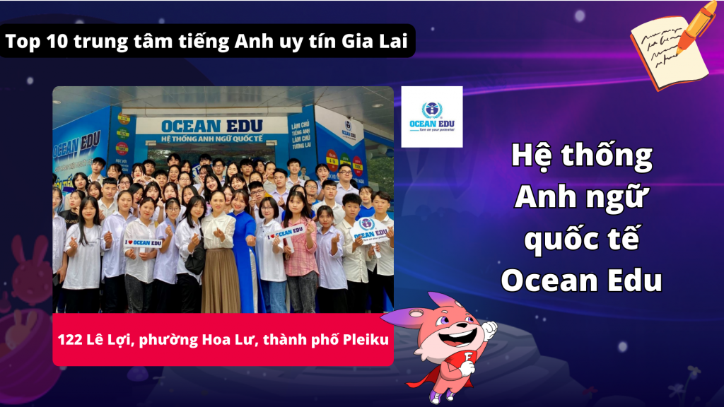 | Hệ thống Anh ngữ quốc tế Ocean Edu | 122 Lê Lợi, phường Hoa Lư, thành phố Pleiku, Gia Lai | Từ 7.000.000 – 24.000.000 VNĐ/ khóa 3-4,5 tháng |