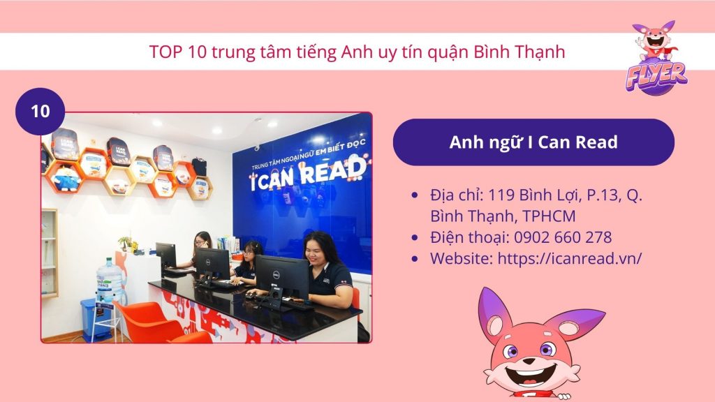| 10 | Hệ thống Anh ngữ I Can Read | Các khóa học tiếng Anh theo phương pháp Ngữ Âm Học, giúp trẻ phát triển chuyên sâu kỹ năng giao tiếp tiếng Anh | 14.880.000 – 22.320.000/ khóa |