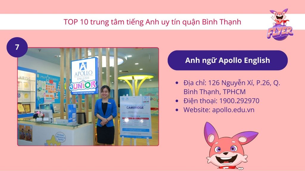 | 7 | Trung tâm Anh ngữ Apollo English | – Các khóa học tiếng Anh trẻ em – Các khóa học luyện thi chứng chỉ tiếng Anh | 7.920.000 – 8.280.000/ khóa |