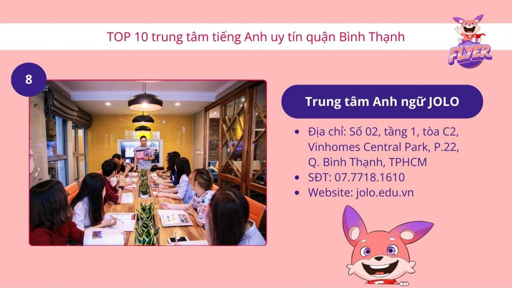 | 8 | Trung tâm Anh ngữ JOLO | Các khóa học tiếng Anh dành cho trẻ em & thanh thiếu niên | 8.019.000 – 16.720.000/ khóa |