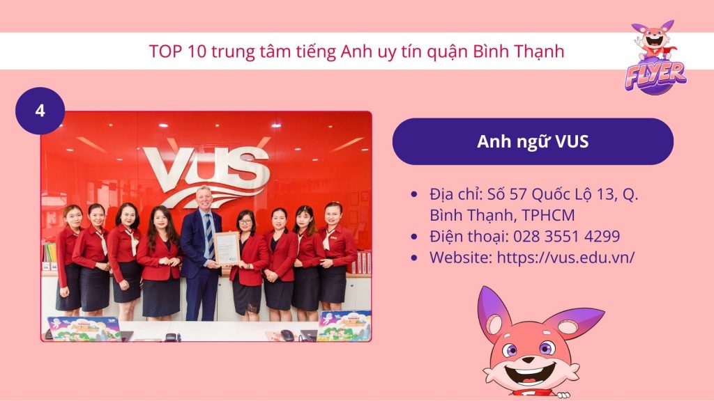 | 4 | Hệ thống trung tâm Anh ngữ VUS | Các khóa học tiếng Anh thông thường, xây dựng nền tảng cho các kỳ thi tiếng Anh học thuật | 5.200.000 – 7.600.000/ khóa |