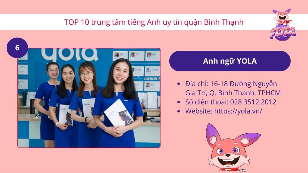 | 6 | Anh ngữ YOLA | Các khóa học tiếng Anh dành cho trẻ em | 780.000/ tháng |