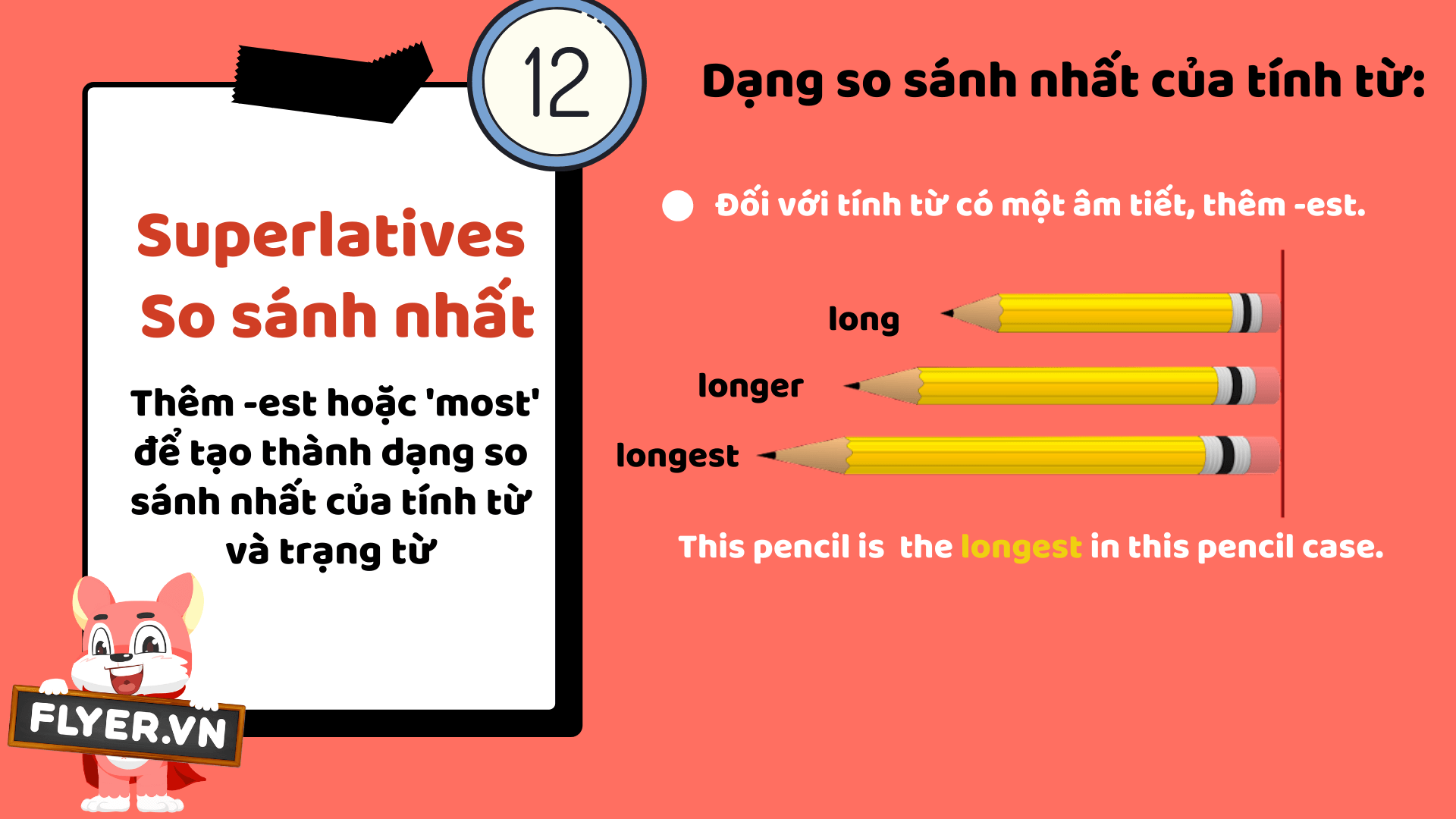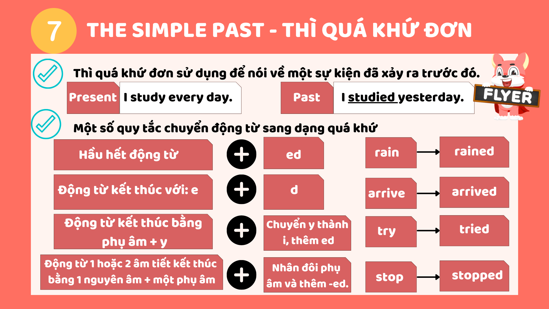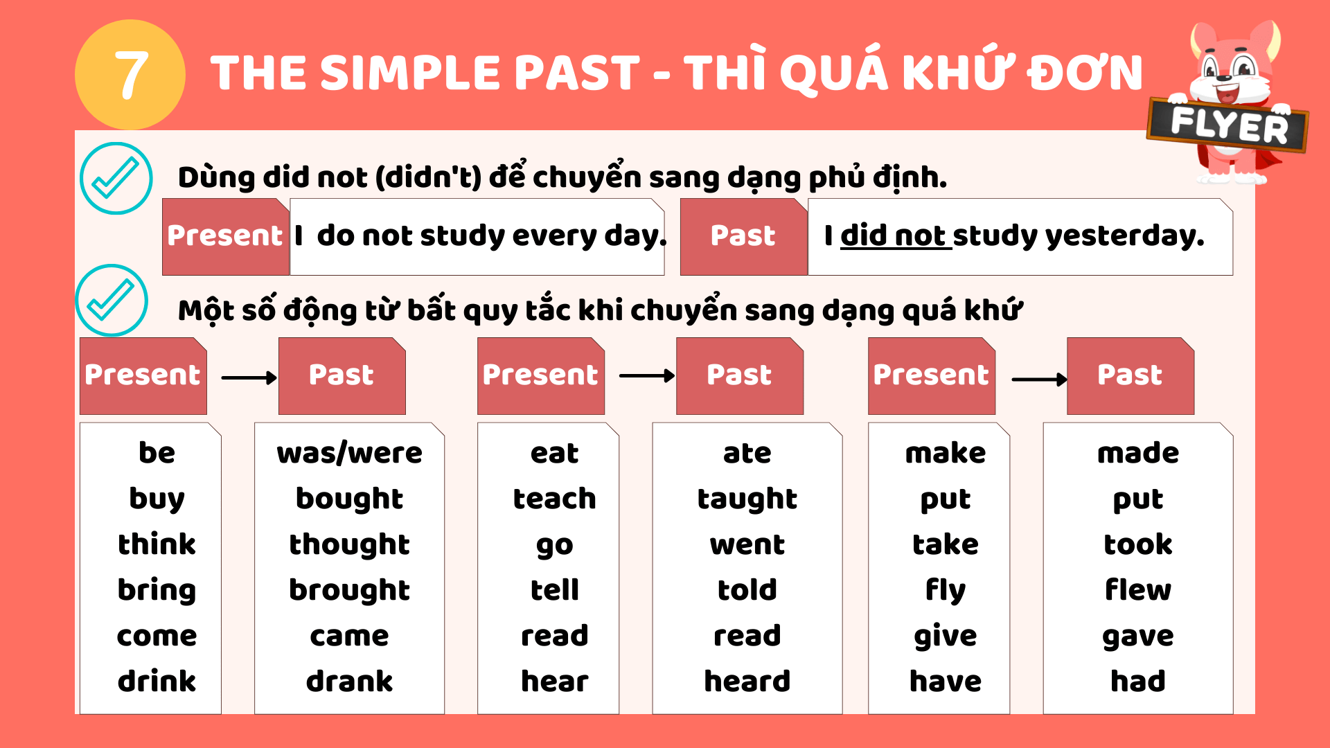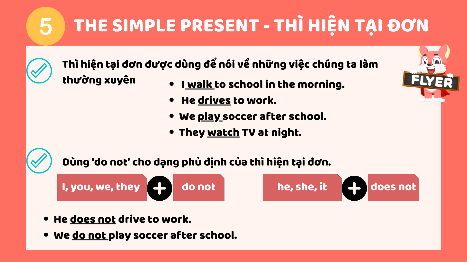 Cấu trúc đề bài thi TOEFL Primary Step 1 chủ yếu là dạng câu hỏi trắc nghiệm, chọn đáp án đúng nhất. Do vậy, việc nắm vững các chủ điểm ngữ pháp sẽ giúp con đọc hiểu và xác định câu trả lời nhanh và chính xác hơn. FLYER tổng hợp 12 chủ điểm ngữ pháp cơ bản nhất dành cho các bạn học sinh đang chuẩn bị cho bài thi TOEFL Primary Step 1 để giúp con hệ thống hóa kiến thức, vững bước hành trang cho kỳ thi quan trọng này..