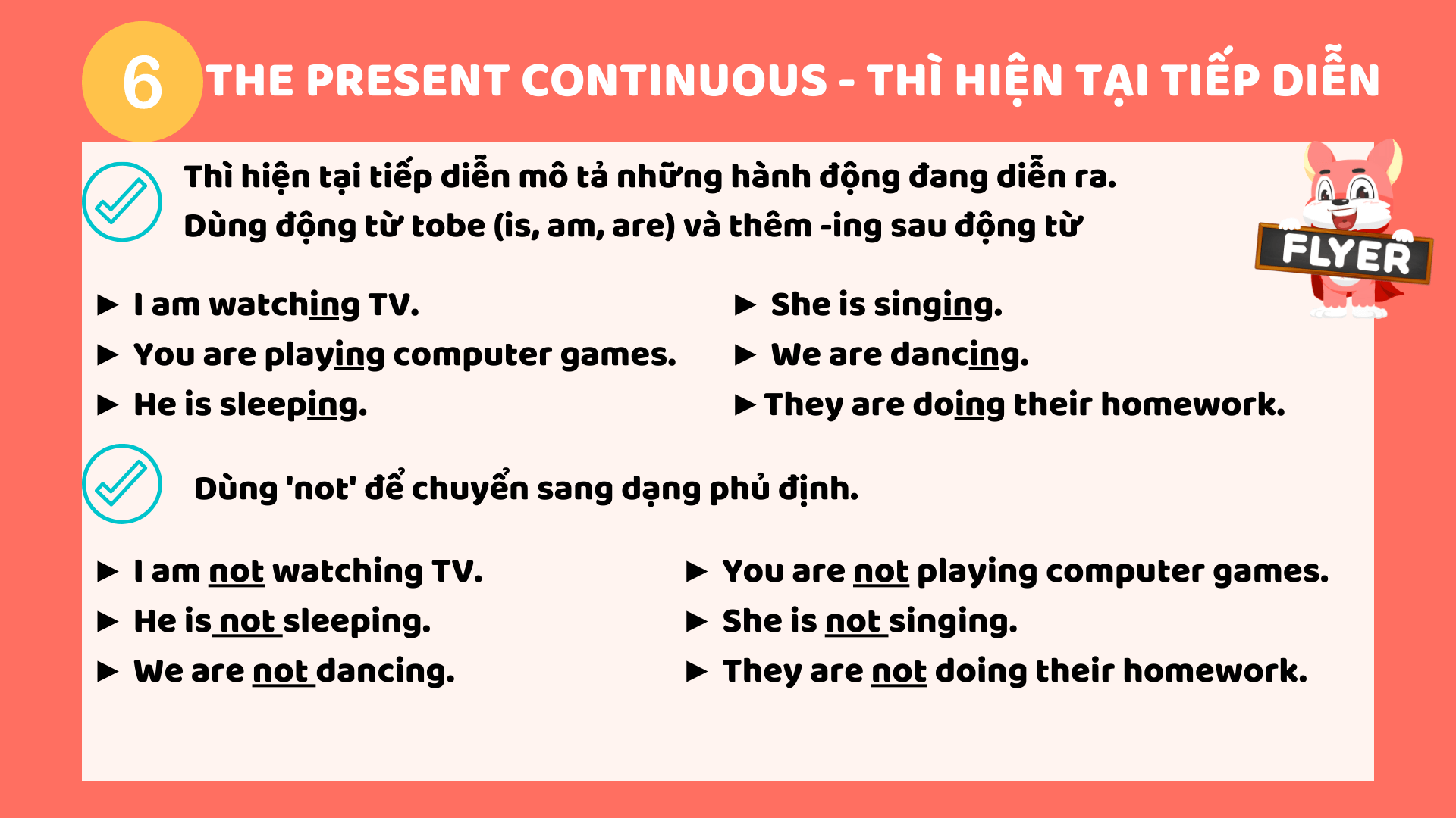 | Phủ định | S + was/ were + not + V_ing was not = wasn’t were not = weren’t | John and his brother weren’t playing football at that time. John và anh trai cậu ấy đang không chơi bóng đá vào lúc đó. |
