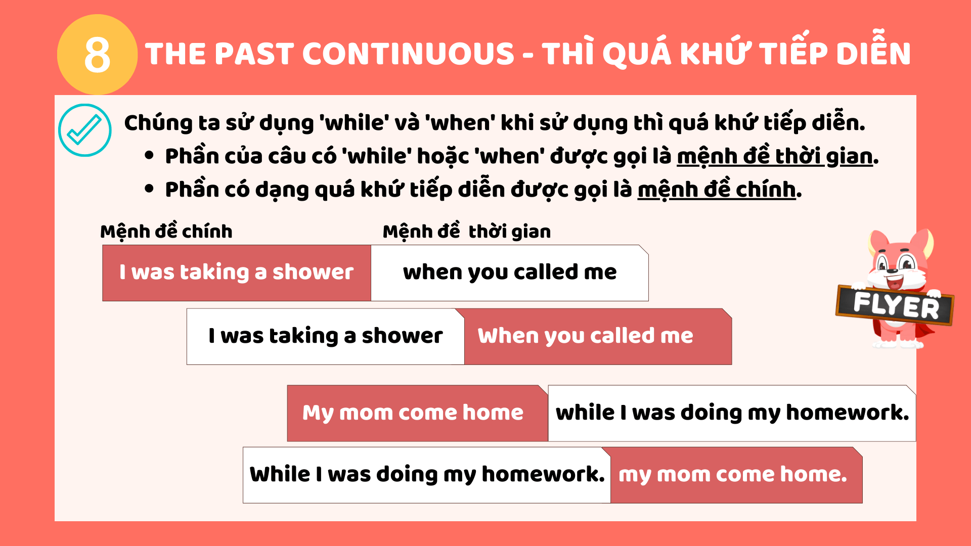 Ngoài ra, thì quá khứ tiếp diễn thường sử dụng “while” và “when” để mô tả hai hành động diễn ra song song trong quá khứ. Dựa vào mệnh đề của “while” và “when”, con có thể chia động từ đúng với thì.