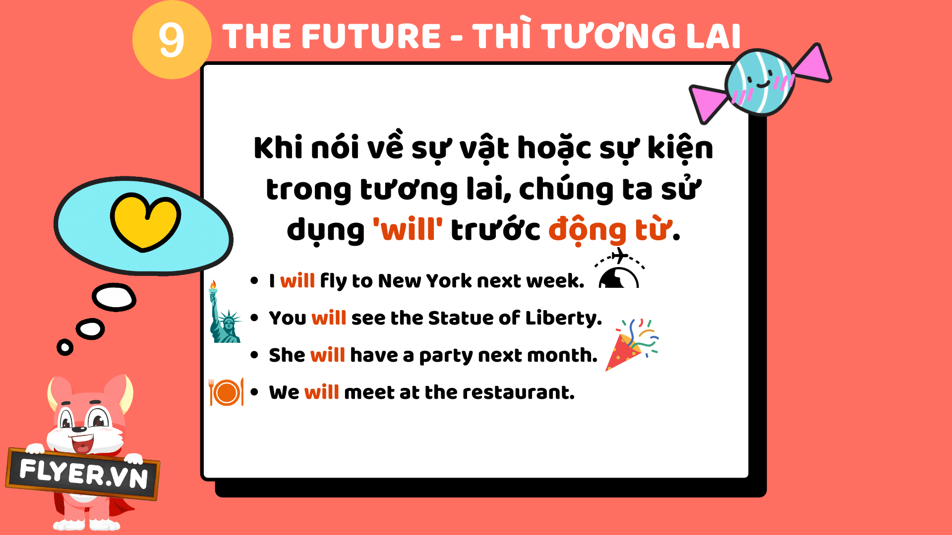 Thì tương lai diễn tả sự việc hoặc hành động nào đó sẽ xảy ra trong tương lai.