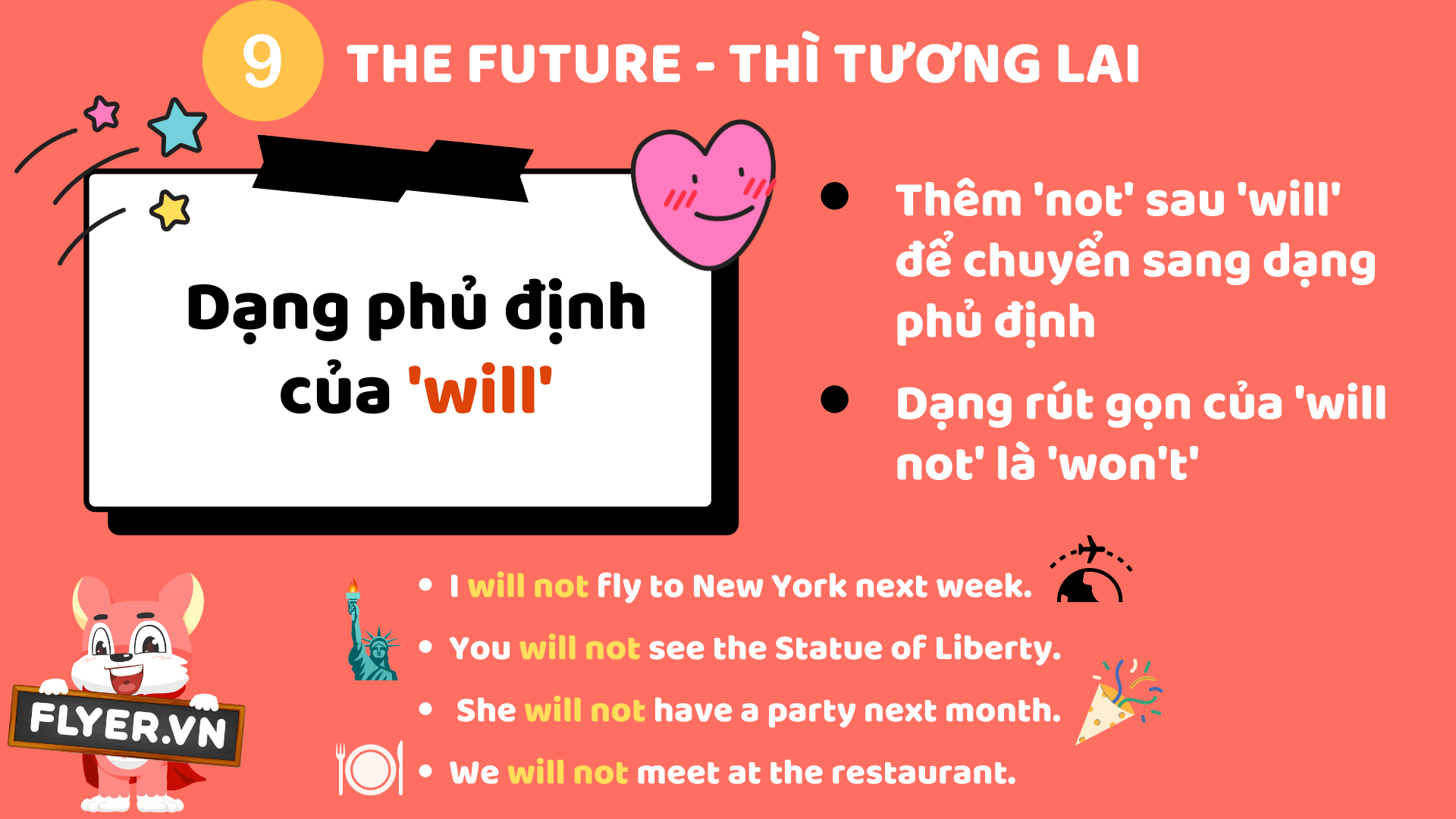 | Phủ định | S + will + not + Vwill not = won’t | Lisa and Jenny won’t buy a new car. Lisa và Jenny sẽ không mua một chiếc xe mới. |