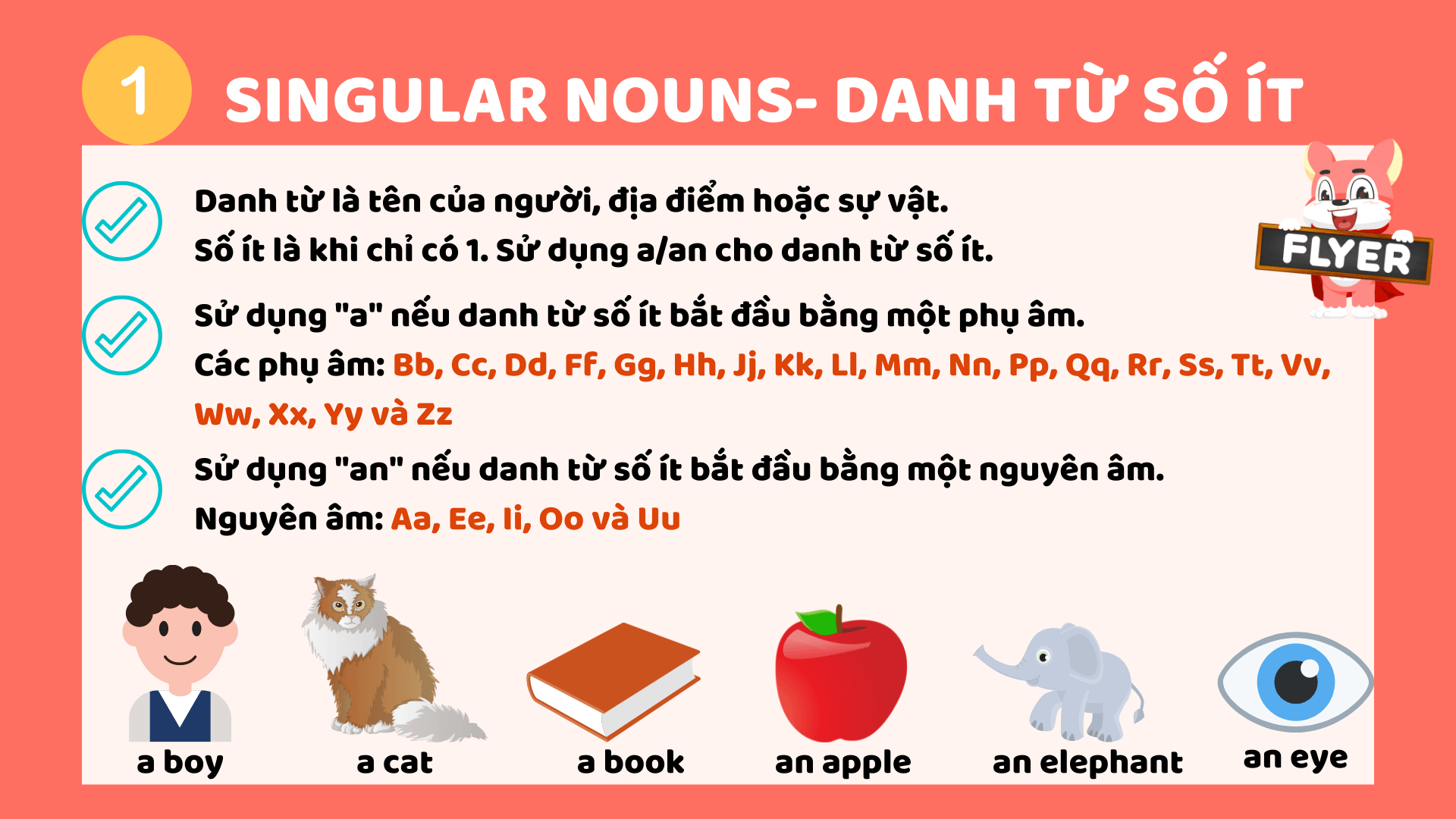 Danh từ là những từ chỉ về con người, địa điểm, sự vật hoặc hiện tượng nào đó. Một danh từ được gọi là danh từ số ít khi chỉ về MỘT người, một địa điểm, một sự vật hoặc một hiện tượng cụ thể.