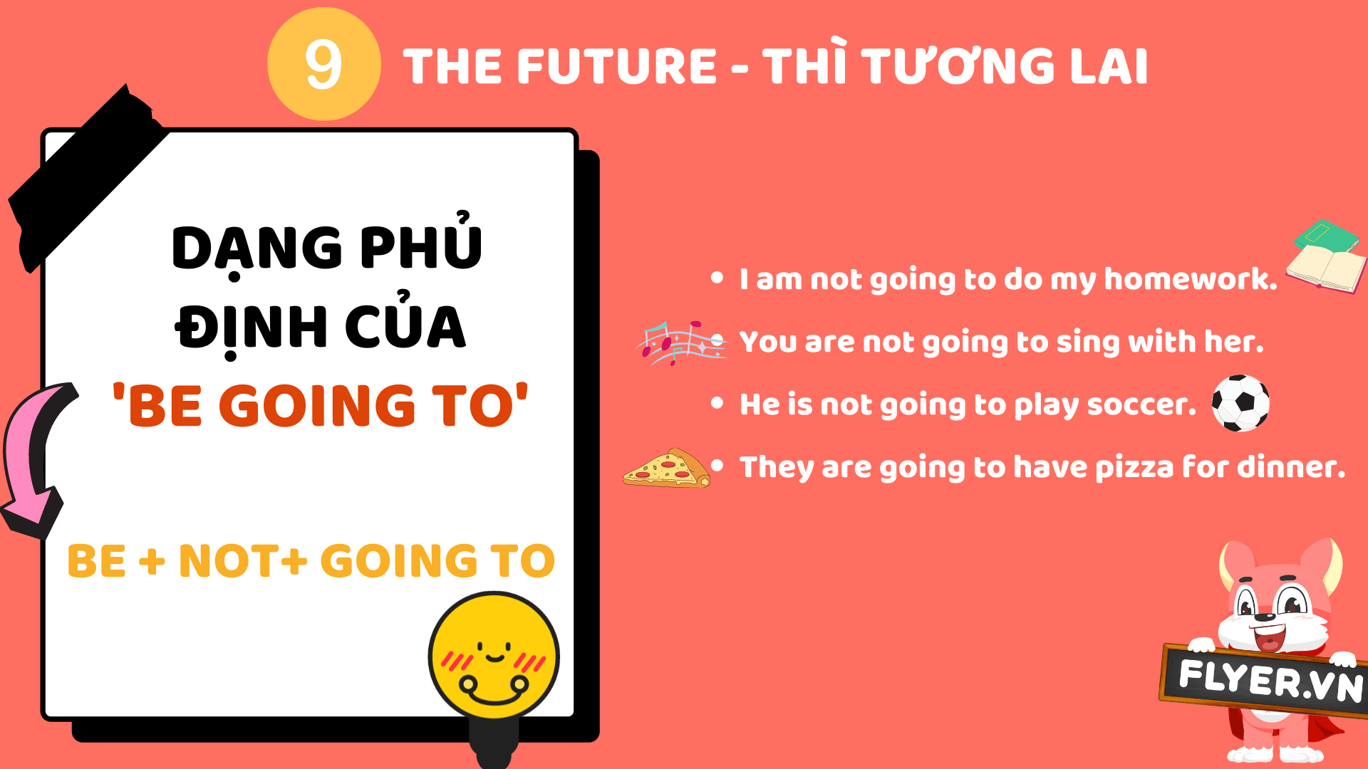 | Phủ định | S + be + not + going to + V is not = isn’t are not = aren’t | I am not going to play board games with them. Tôi không định chơi cờ bàn với họ. |