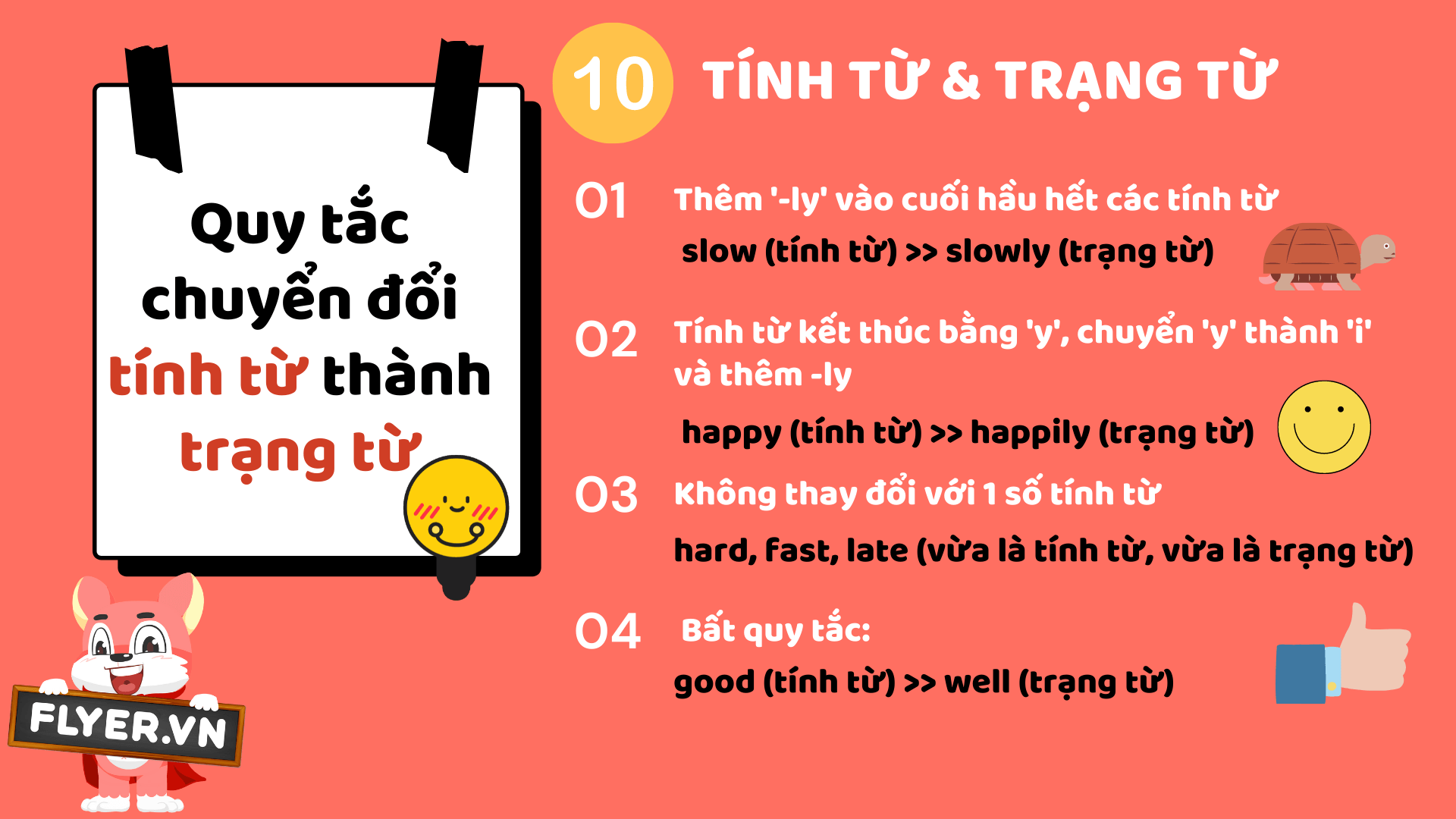 Tính từ có thể chuyển đổi sang trạng từ bằng cách thêm đuôi -ly. Con cần nhớ một số quy tắc thêm đuôi -ly cơ bản sau: