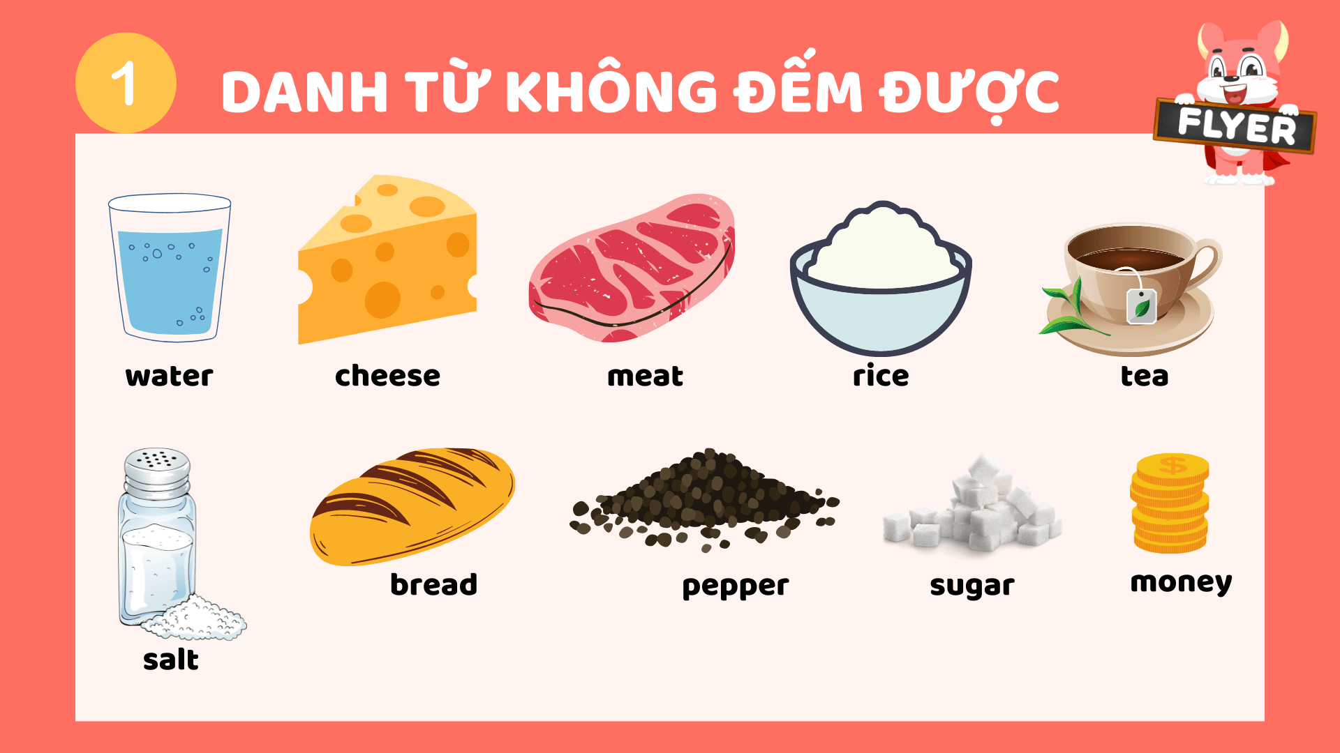 Lưu ý: Các từ không đếm được KHÔNG phân biệt số ít hay số nhiều.