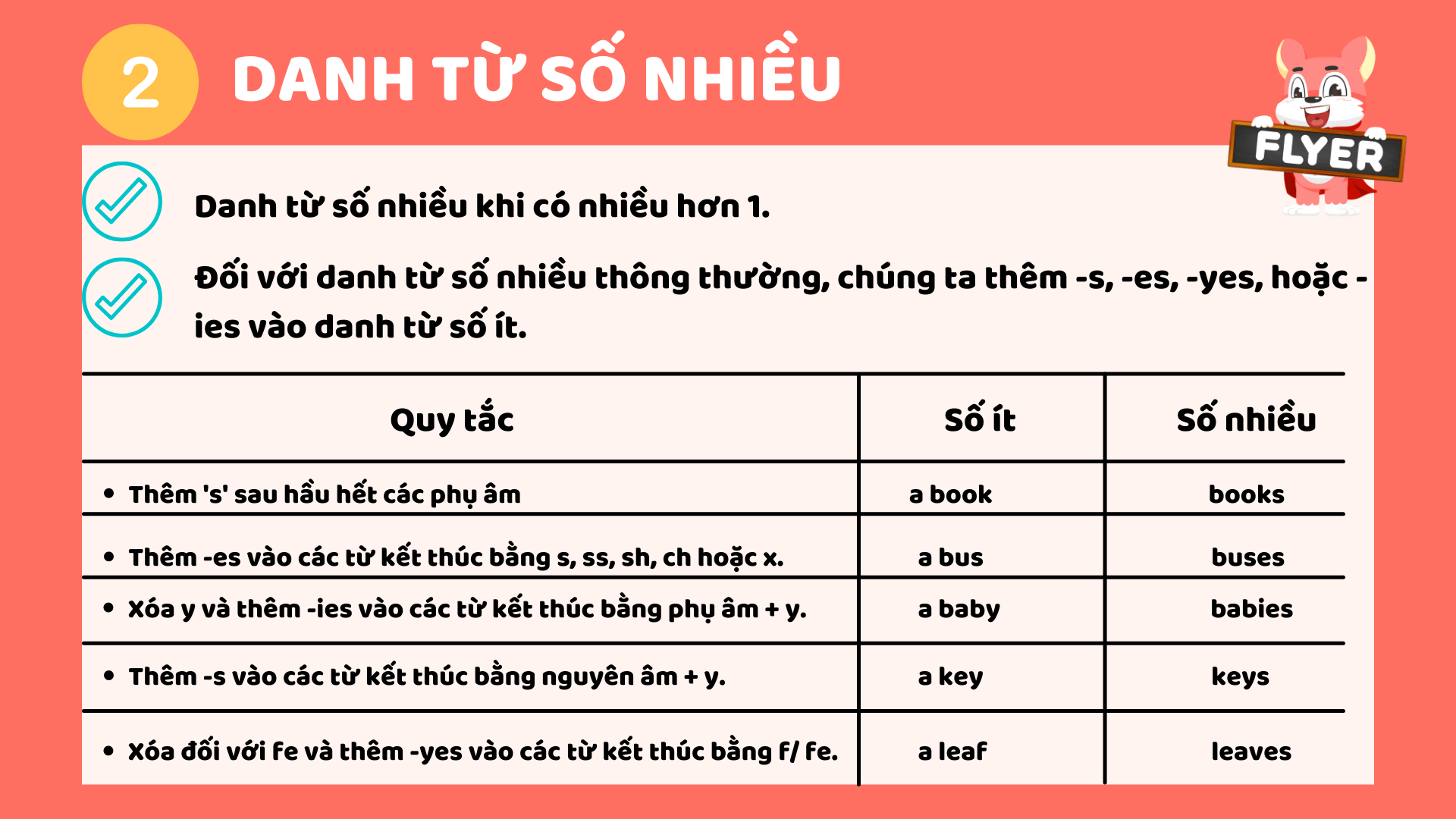 | Danh từ kết thúc bằng phụ âm + “o” → Thêm -es | a hero → heroes a potato → potatoes a tomato → tomatoes Ngoại lệ: a photo → photos a piano → pianos a radio → radios |