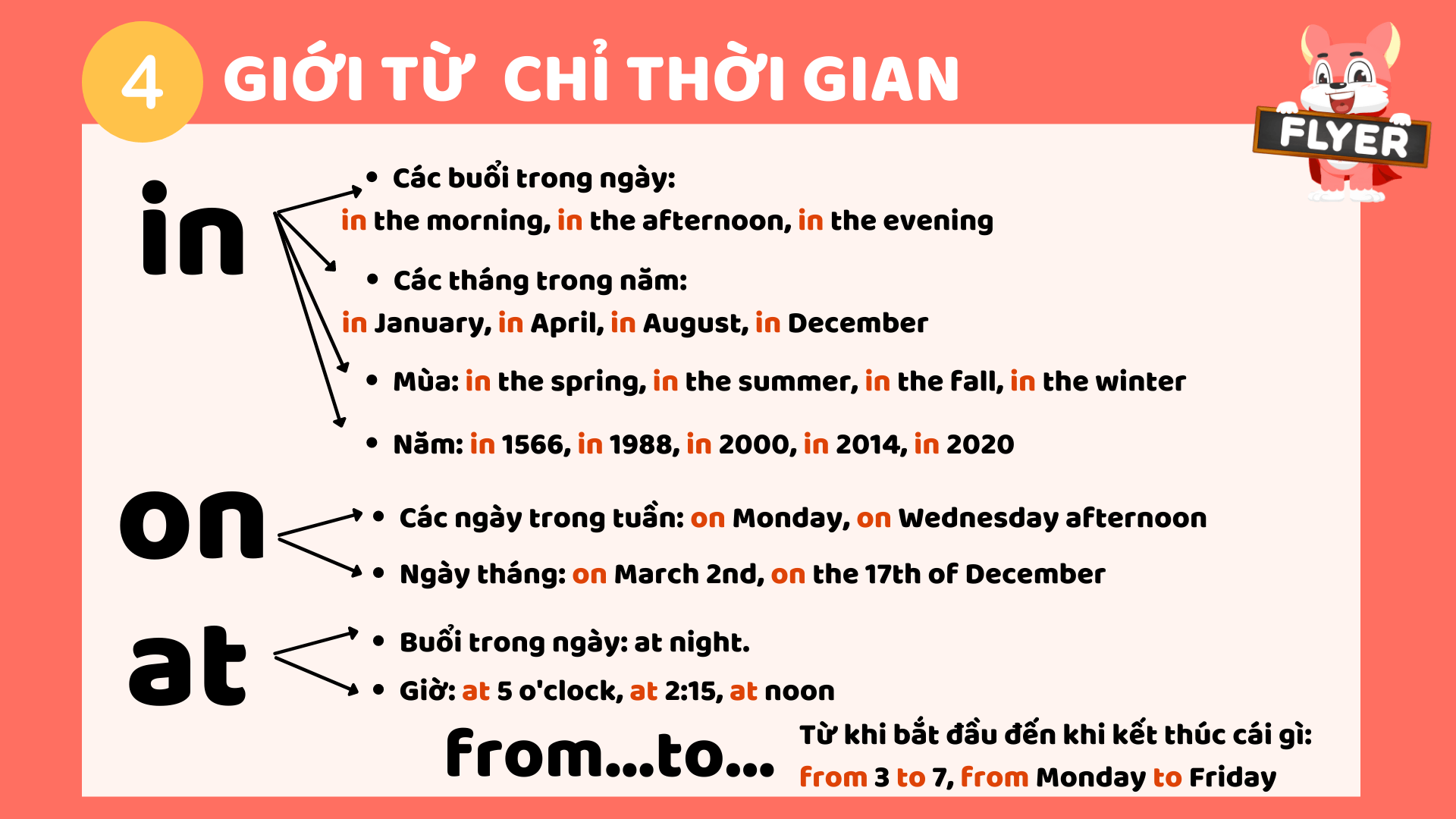 Cách dùng các giới từ chỉ thời gian “at”, “in” và “on”: