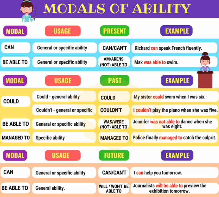 - Can: diễn tả khả năng ai đó có thể làm gì đó, yêu cầu, sự cho phép