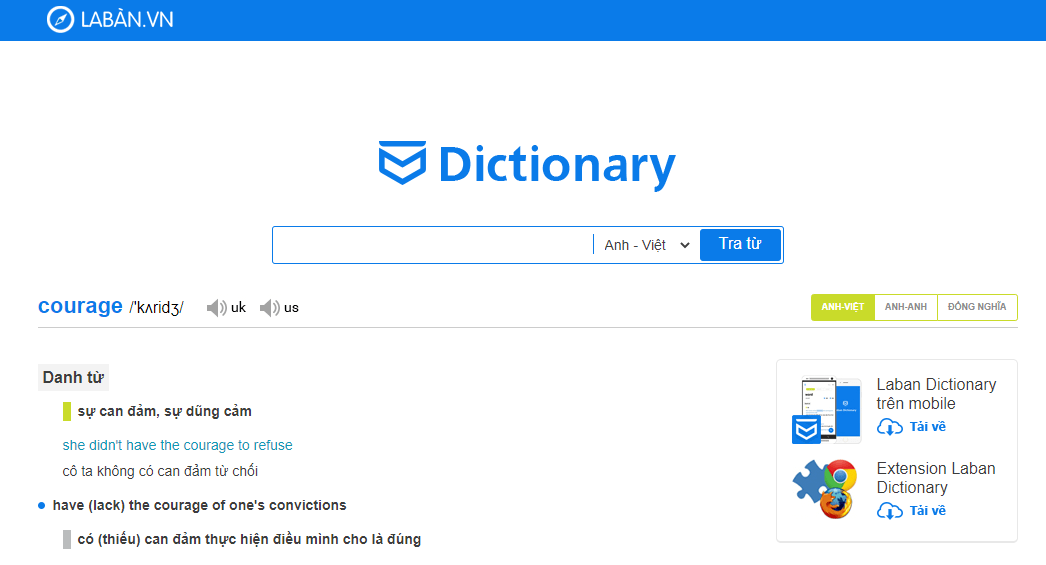 Laban.vn là bộ từ điển miễn phí bao gồm các từ điển Anh – Việt, Việt – Anh và Anh – Anh. Với kho từ đồ sộ cùng hệ thống gợi ý từ thông minh, Laban.vn giúp người dùng có thể tra cứu nghĩa của từ một cách nhanh chóng nhất. Ngoài website, đội ngũ Laban.vn đã phát triển version ứng dụng từ điển trên điện thoại, tạo thuận lợi cho người dùng.