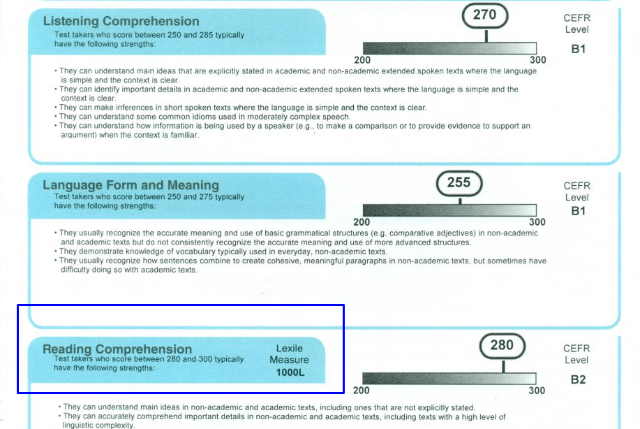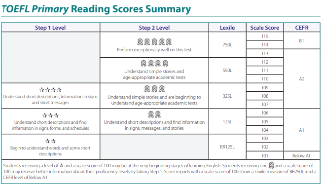 Ba mẹ chắc hẳn đã chú ý đến điểm Lexile tương ứng với số sao/số huy hiệu/số điểm con đạt được trên chứng chỉ TOEFL Primary / TOEFL Junior của con. Điểm Lexile có ký hiệu chữ L. Ví dụ, học sinh có thể đạt 800L, tức 800 điểm Lexile. Điểm số này càng cao thì càng thể hiện trình độ đọc hiểu cao của học sinh. Hệ thống đánh giá Lexile có điểm thấp nhất là 5L. Điểm cao nhất là 2200L. Dưới 5L được coi là BR tức Beginning Reader (người mới bắt đầu).