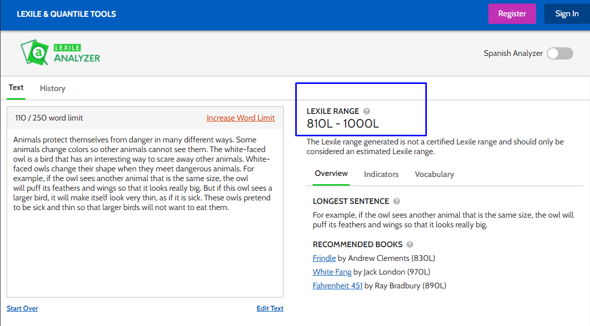 Dựa vào các đặc điểm ngôn ngữ như độ dài câu, độ phức tạp của từ vựng và cấu trúc, công cụ này sẽ trả về kết quả cấp độ Lexile của phần text. Ví dụ: 610L-800L, 810L-1000L