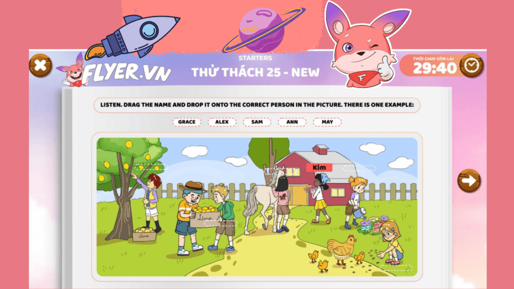 - Các dạng câu hỏi đa dạng, thú vị: FLYER mang đến cho bạn những trải nghiệm các dạng bài tập đa dạng như trắc nghiệm, nghe điền từ, tô màu,… Tại phần Listening, bạn sẽ được nghe file audio và trả lời những câu hỏi theo như đề bài yêu cầu.