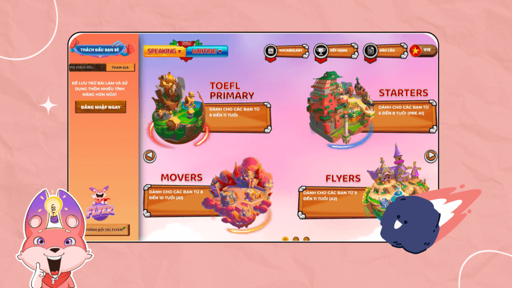FLYER là nền tảng giúp trẻ em ở lứa tuổi 6-15 tuổi nâng cao các kỹ năng liên quan đến tiếng Anh thông qua hàng trăm đề ôn luyện trực tuyến. Các đề thi tại phòng luyện thi ảo FLYER luôn được cập nhật liên tục, xây dựng theo chuẩn các kỳ thi của Đại học Cambridge và ETS (Viện khảo thí giáo dục Hoa Kỳ).