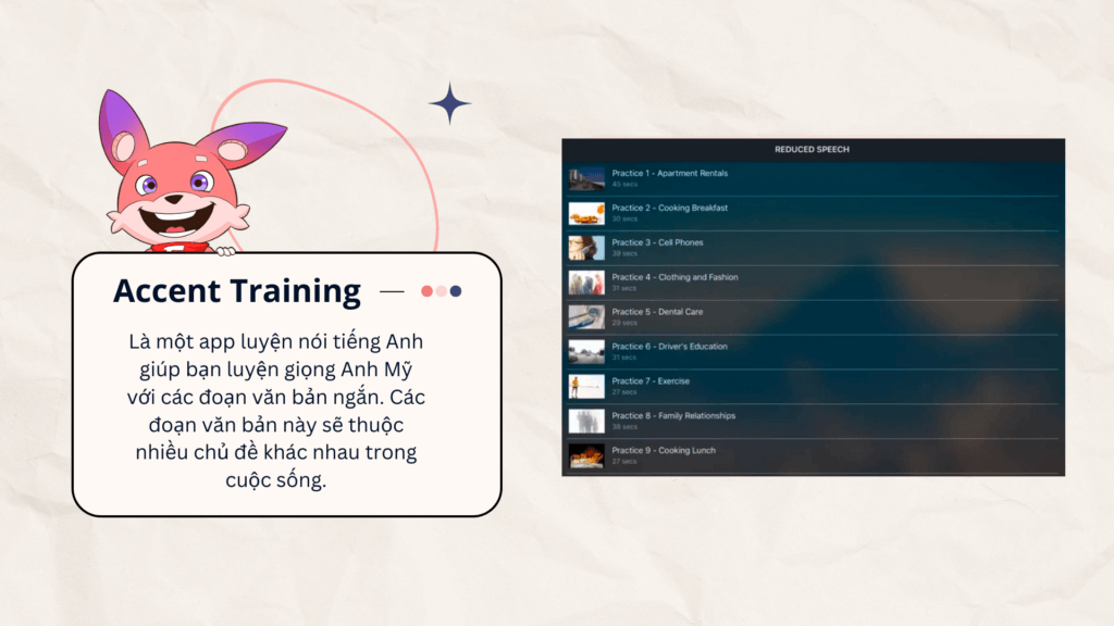 Accent Training là một app luyện nói tiếng Anh giúp bạn luyện giọng Anh Mỹ với các đoạn văn bản ngắn. Các đoạn văn bản này sẽ thuộc nhiều chủ đề khác nhau trong cuộc sống. Với mỗi đoạn văn bản, bạn có thể nghe người bản xứ đọc và đọc theo các câu mà người bản xứ nói. Bạn có thể ghi âm giọng của mình và nghe lại để so sánh với phiên bản gốc. Đây là cách luyện hiệu quả để kiểm tra cách phát âm của bạn, cho biết bạn phát âm chưa ổn ở đâu, điểm mạnh và điểm yếu trong bài nói của bạn là gì.