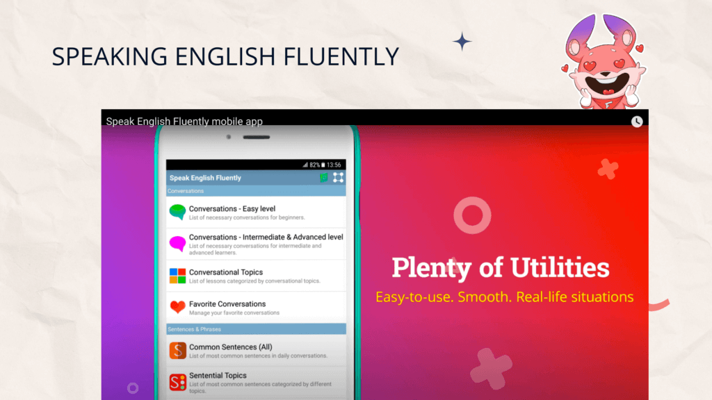 Đây là ứng dụng luyện nói tiếng Anh giúp bạn luyện tập kỹ năng sơ cấp và trung cấp. App cung cấp rất nhiều mẫu hội thoại tiếng Anh thường gặp trong cuộc sống hằng ngày. Các đoạn hội thoại trên app này đều được thuật lại bởi giọng Anh Mỹ. Bên cạnh các đoạn hội thoại, bạn cũng có thể xem danh sách các câu và từ vựng phổ biến. Để luyện nói tiếng Anh trên ứng dụng này, bạn ghi âm giọng nói của mình khi đọc câu và ứng dụng sẽ so sánh giọng nói của bạn với phiên bản gốc.