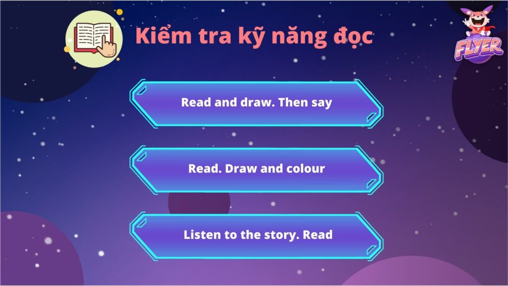 | Read. Draw and colour (Đọc. Vẽ và tô màu) | Bé sẽ đọc nội dung đã cho, sau đó vẽ và tô màu theo hướng dẫn. |
