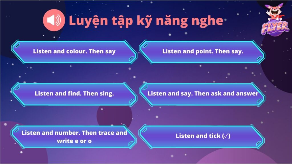 | Listen and circle (Nghe và khoanh tròn) | Các bé sẽ nghe đoạn audio và khoanh tròn đáp án đúng |