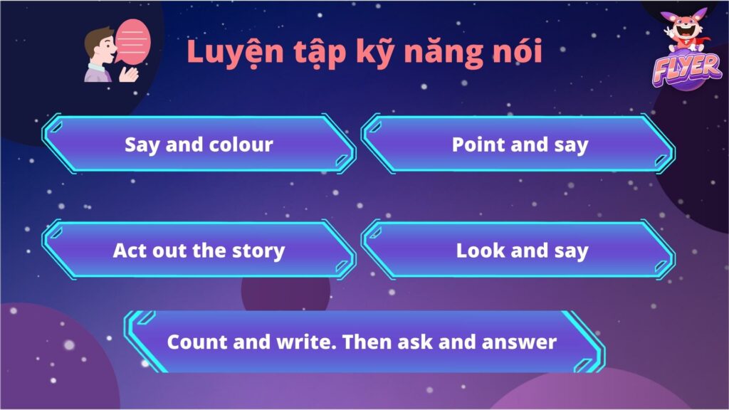 | Look and say (Nhìn hình và nói theo) | Bé sẽ nhìn vào hình đã cho và tập nói theo các cấu trúc đã học. |
