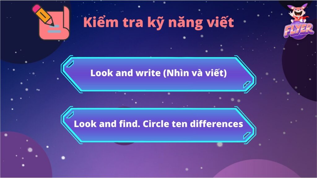 | Look and write (Nhìn và viết) | Ở bài tập này, bé sẽ nhìn vào hình ảnh đã cho và điền đáp án đúng vào chỗ trống |