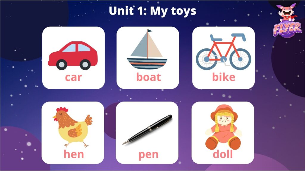 Đến với chủ đề đầu tiên, bé sẽ được làm quen với từ vựng về các món đồ chơi và số đếm từ 11-20; theo đó, bé sẽ được học thêm cấu trúc hỏi về đồ vật và số lượng đồ vật. Về phần ngữ âm, các bé sẽ luyện tập 2 ngữ âm là “/e/” và “/ɒ/”.