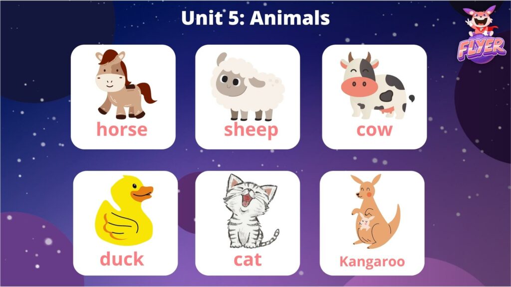 Cùng khám phá thế giới động vật qua unit 5: Animals. Tại đây, bé sẽ học cách gọi tên những con vật quen thuộc, cách đặt câu hỏi và trả lời về đặc điểm của chúng. Về phần ngữ âm, bé sẽ được tìm hiểu về ngữ âm quen thuộc là âm “/k/”.