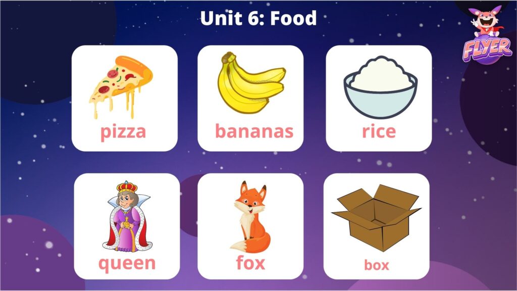 Nếu muốn nói “Mình thích ăn cá.” hay “Mình không thích ăn pizza” thì bé sẽ nói như thế nào? Ở unit 6 – chủ đề về đồ ăn, bé sẽ được học từ vựng về các món ăn quen thuộc hàng ngày và cấu trúc diễn tả món ăn mình thích và không thích. Sau cùng là phần luyện ngữ âm với hai âm “/kw/” và “/ks/”.