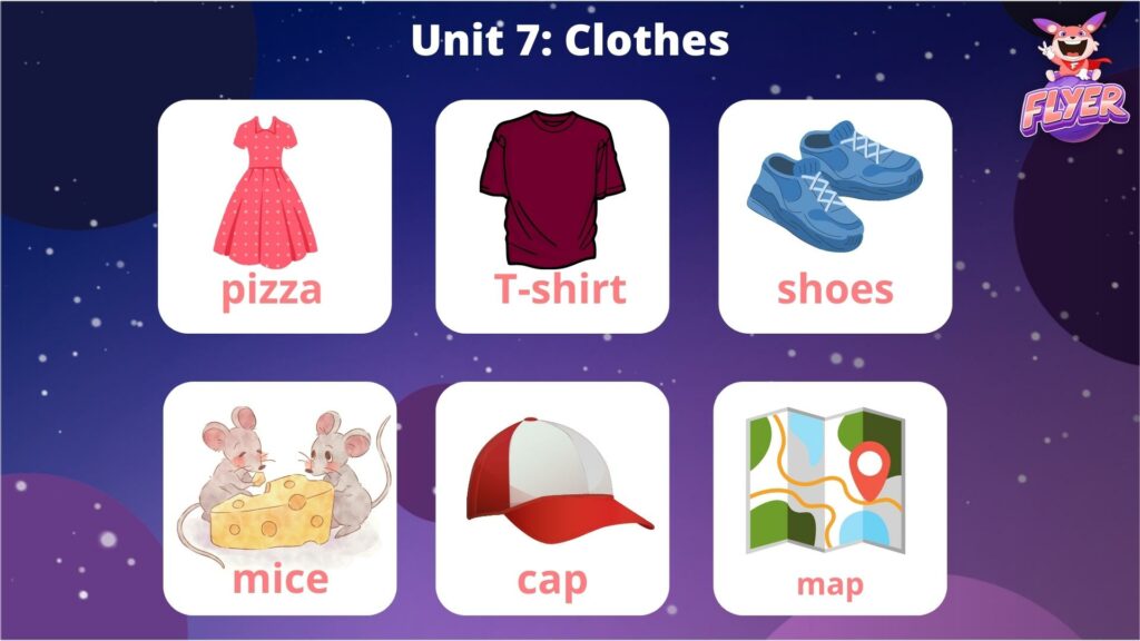 Với chủ đề về quần áo này, các bé sẽ được học từ vựng về trang phục hằng ngày như: áo thun, váy, đầm,.. Ngoài ra, bé còn được học cách miêu tả quần áo chi tiết hơn và làm quen với các câu mệnh lệnh liên quan đến chủ đề này. Về phần ngữ âm, hai âm “/aɪ/” và “/p/” chính là nội dung chính của unit 7.