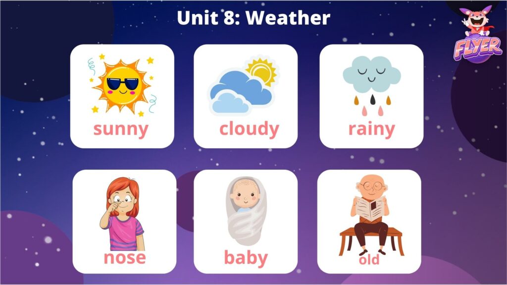 Chủ đề cuối cùng trong sách sẽ giúp bé làm quen với các từ vựng về thời tiết. Bé sẽ được học cách đặt câu hỏi về thời tiết mà bé yêu thích cũng như cách miêu tả chúng. Phần ngữ âm của unit này là hai âm “/əʊ/” và “/eɪ/”.