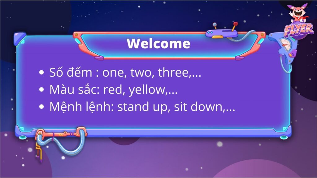 Ở phần mở đầu này, các bé sẽ được ôn luyện lại những từ vựng quen thuộc như từ vựng về số đếm từ 1-10, màu sắc cơ bản và một số cụm động từ đơn giản.