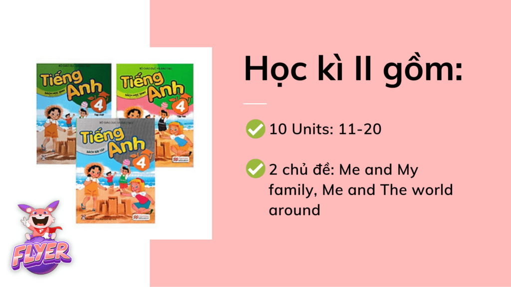 Trong học kì II, các bé sẽ học 10 Units (Unit 11-20) với 2 chủ đề chính: Me and My family (Tôi và gia đình tôi) và Me and The world around (Tôi về thế giới xung quanh). Trong đó, mỗi chủ đề bao gồm 5 Units.