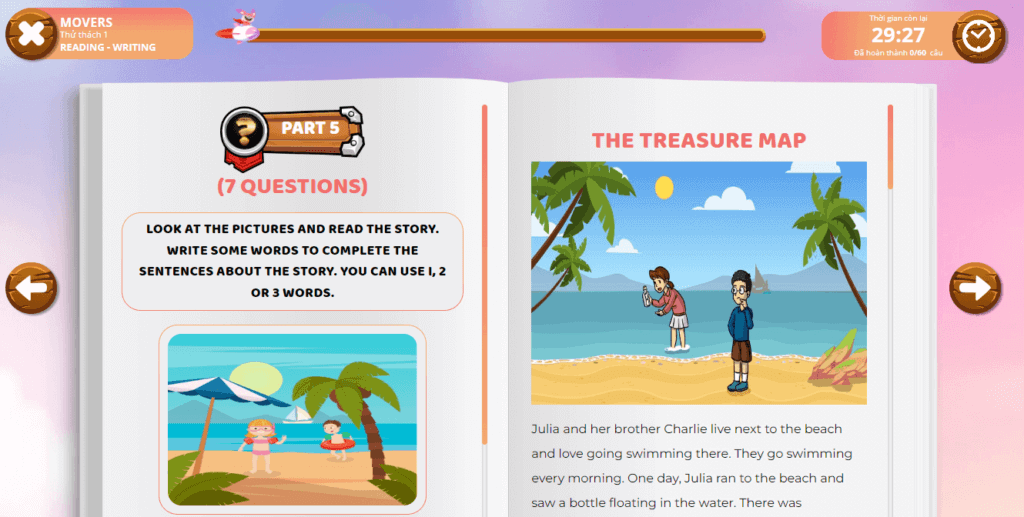 Khi làm Reading & Writing Part 5 (Đọc-viết Phần 5) của bài thi Movers Cambridge, thí sinh sẽ đọc 1 câu chuyện bao gồm 3 phần. Mỗi phần có 1 tranh minh hoạ. Thí sinh hoàn thành câu với 1, 2 hoặc 3 từ thích hợp.