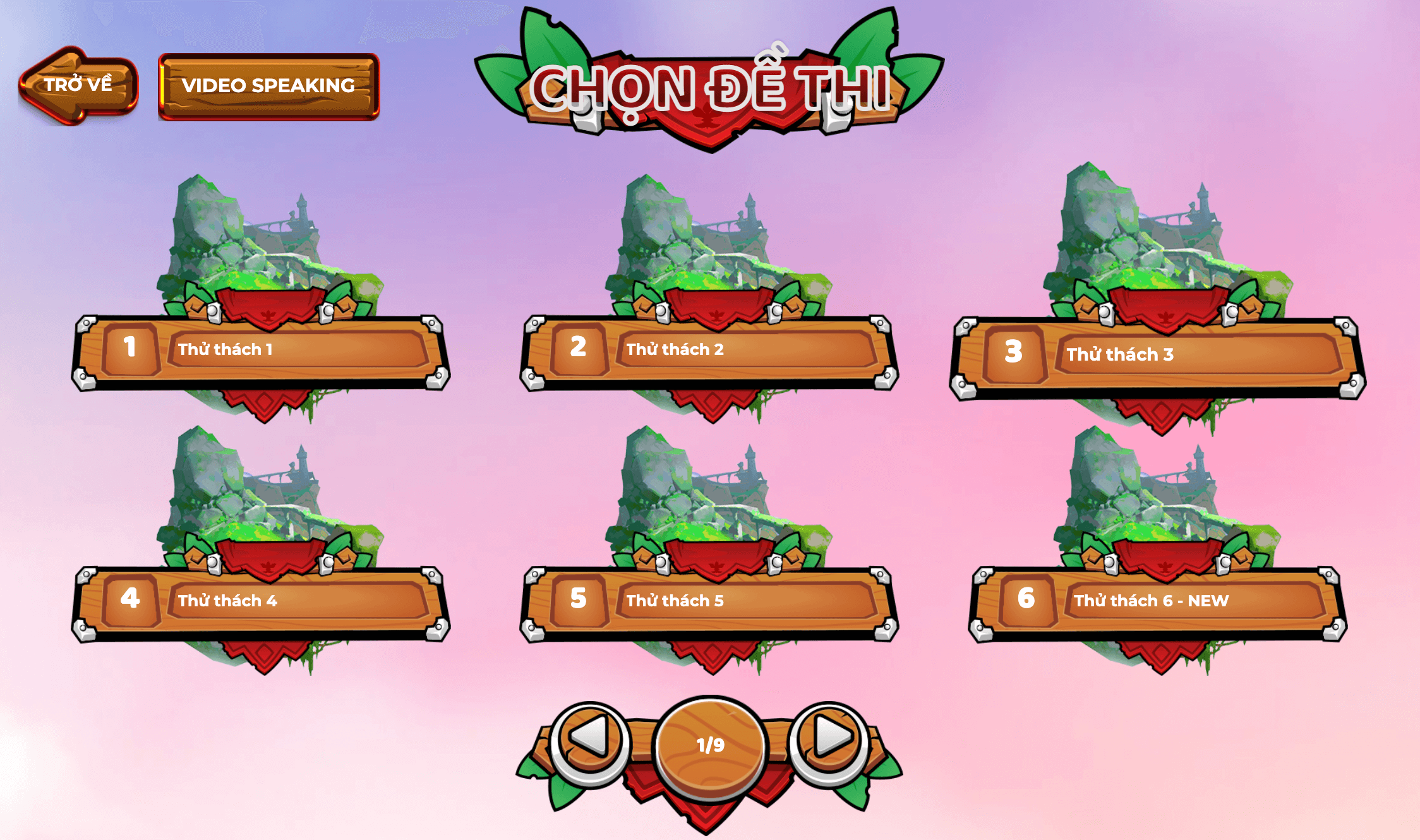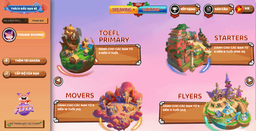 Người học chọn bài thi mình đang ôn tập trong hệ thống các bài thi hiện có của phòng luyện thi ảo FLYER, bao gồm Starters, Movers, Flyers và Toefl Primary.