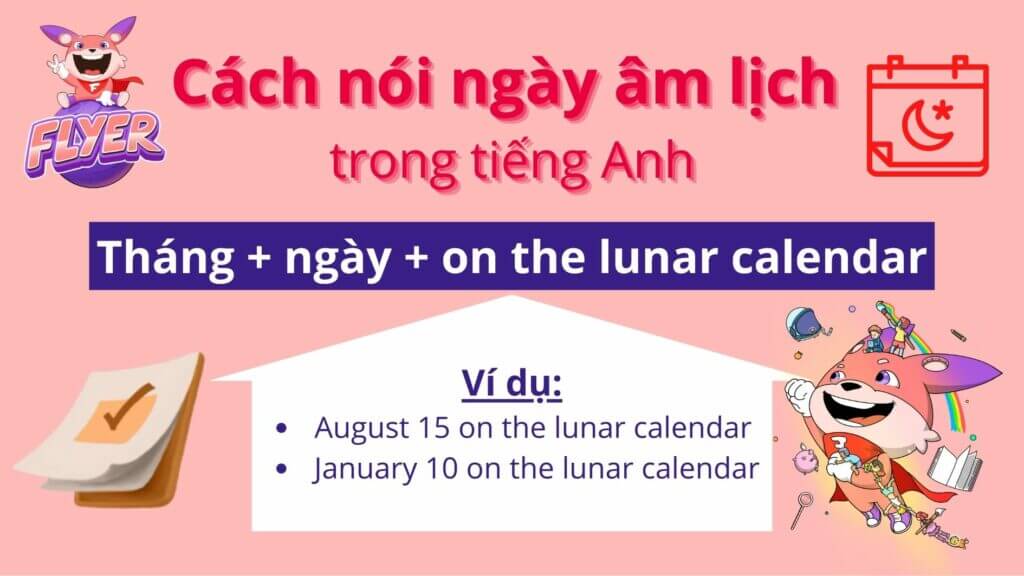 Âm lịch trong tiếng Anh là “lunar calendar”, khi kết hợp với một ngày âm, bạn sẽ sử dụng cụm “tháng âm + ngày âm + on the lunar calendar”.