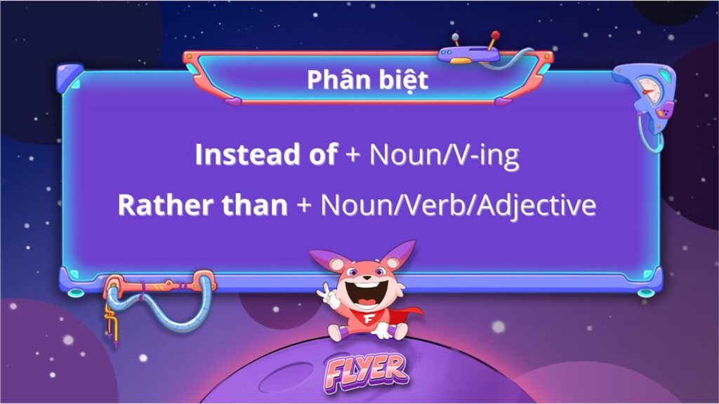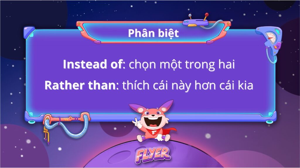 Cấu trúc “Instead of” rất thường được sử dụng nhưng cũng dễ gây nhầm lẫn với một số từ như “Rather than” hay “Instead”. Ví dụ tại sao đôi khi chúng ta dùng “I want to play game rather than do exercise” và khi khác lại dùng là “I like playing game instead of doing exercise”? Hãy cùng FLYER chinh phục cấu trúc này và khám phá tất tần tật các từ đồng nghĩa, trái nghĩa với “Instead of” ngay trong bài viết dưới đây chỉ trong 5 phút bạn nhé!
