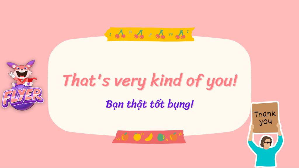 | That’s very kind of you. That’s very kind. | Bạn thật tốt.Điều bạn làm thật tuyệt. |